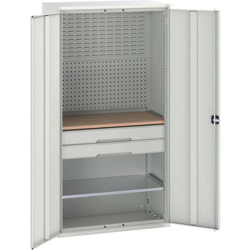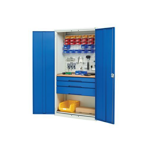 Oppbevar verktøyene dine pent i dette verkstedskapet med skuffer. Bunnen består av perforerte paneler og paneler med innvendig hyllekledning. Juster hyllehøyden enkelt. Lås dørene sikkert med trepunktslåsemekanismen og sylinderlåsen. Skuffene har kulelager for jevn åpning og lukking. Sikkerhetsråd: - plasser møbelet på en flat overflate - fest det til en vegg eller skillevegg med egnede festemidler - sørg for at maksimal anbefalt belastning ikke overskrides og at den er godt fordelt