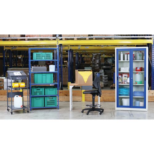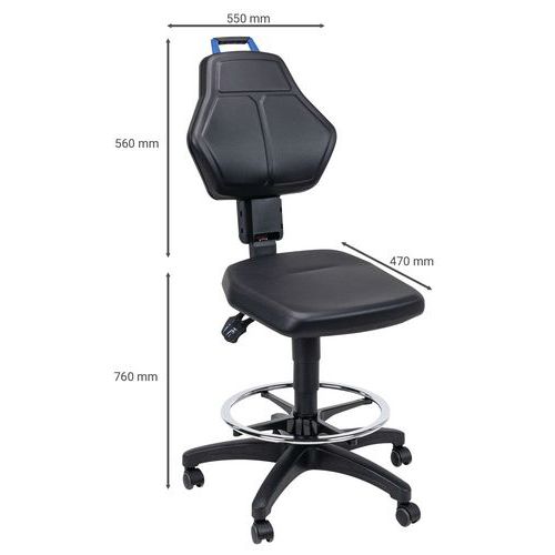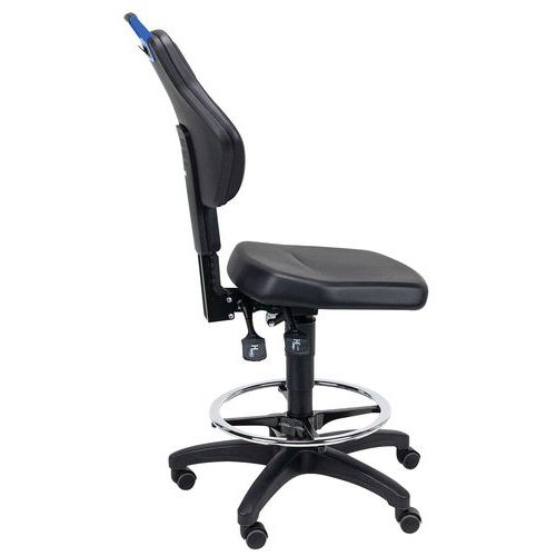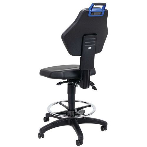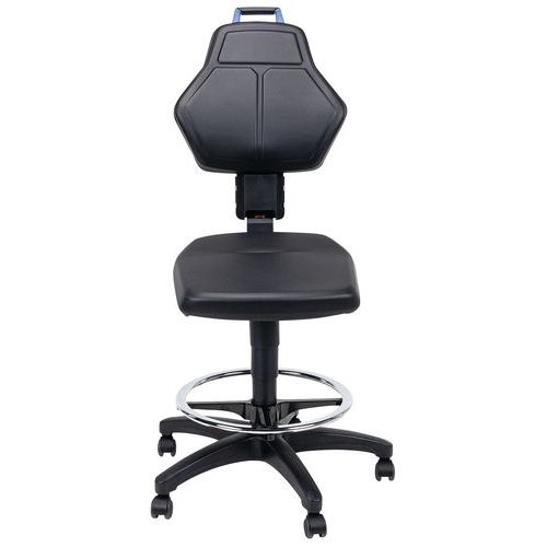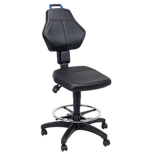 | Varenavn | Verkstedsstol – høy på selvlåsende svinghjul, Sete, materiale: Kunstlær, Ryggstøtte: ja, Modell stoler: Høy |