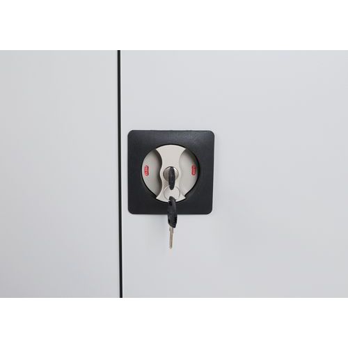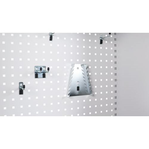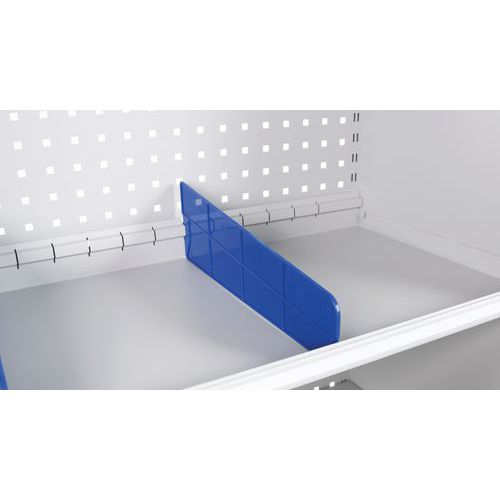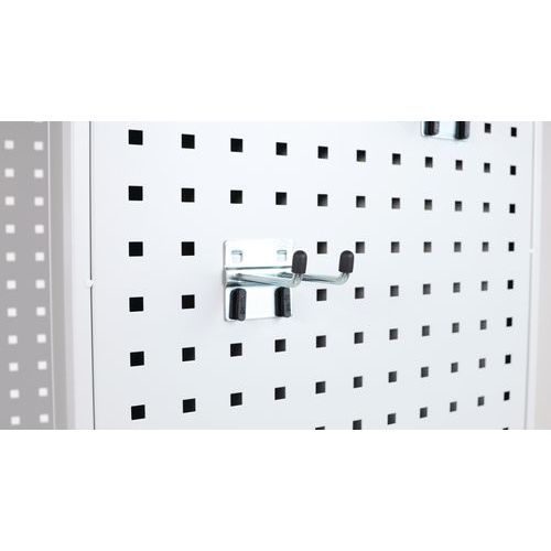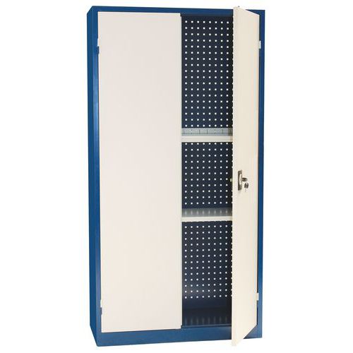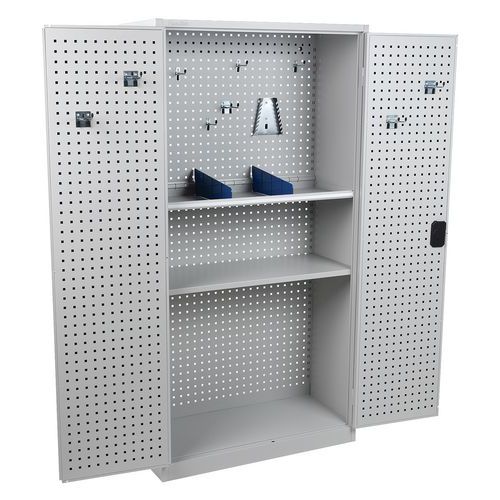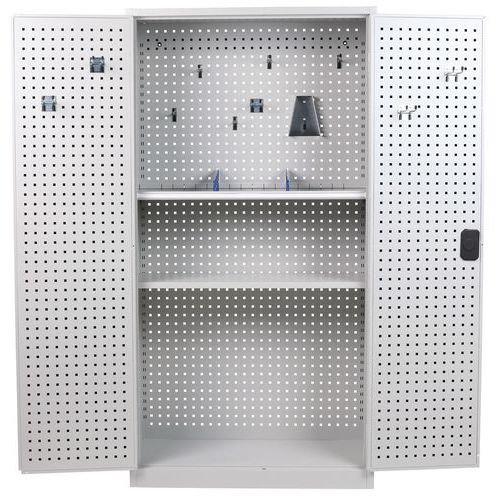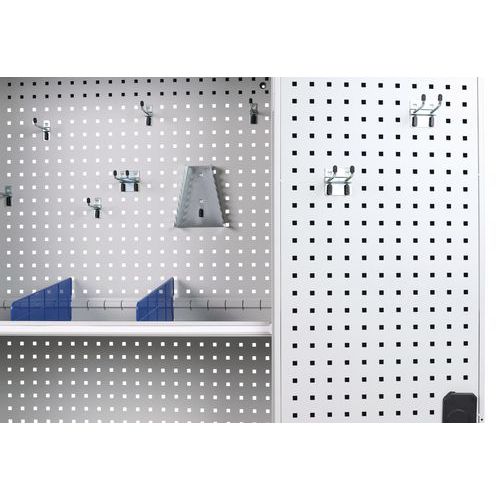 Perforert bakvegg og dører. Hylleplatene kan flyttes i trinn på 3,6 cm. Låsbare dører: 2-punktslukking og sylinderlås. Praktisk oppbevaring takket være dører som kan åpnes 180°. Leveres med 1 sett kroker, hyller og skillevegger.