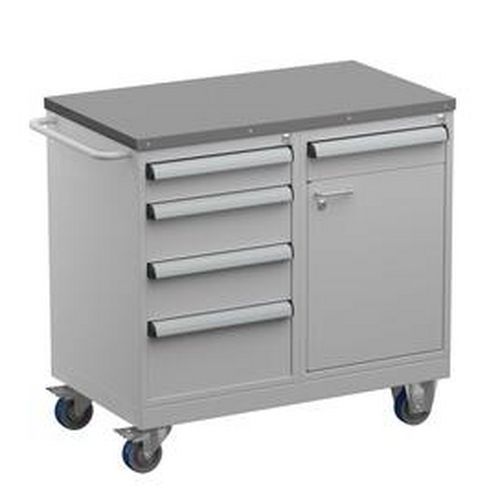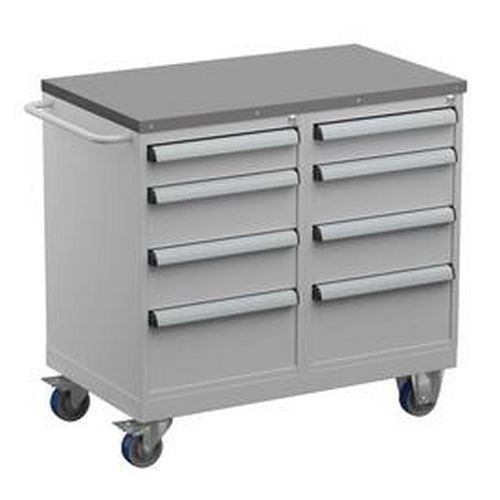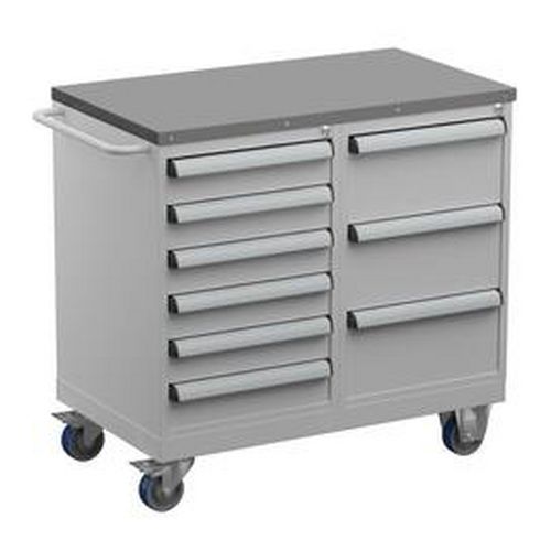 Verktøyvogn 3 med stålplate er en lettflyttet og robust oppbevaringsløsning med ulike konfigurasjoner av skuffer eller dører, designet for effektiv organisering av verktøy og utstyr. Vognen har en bredde på 910 mm, en dybde på 525 mm og en høyde på 880 mm, og kan lastes med opptil 300 kg totalt, med en maksbelastning per hylle på 50 kg. Hver skuff har en maksimal lastekapasitet på 60 kg og åpnes til 100 % for enkel tilgang. Laget i epoksybelagt stål med en slitesterk stålplate på toppen, er vognen både holdbar og praktisk. Den leveres med skuffer i forskjellige størrelser (2x100 mm, 4x150 mm, 2x200 mm) og finnes i lysegrå RAL7035.