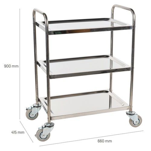 | Varenavn | Vogn i rustfritt stål, Kapasitet: 100 kg, Totalhøyde: 900 mm, Totalbredde: 415 mm, Totallengde: 660 mm |